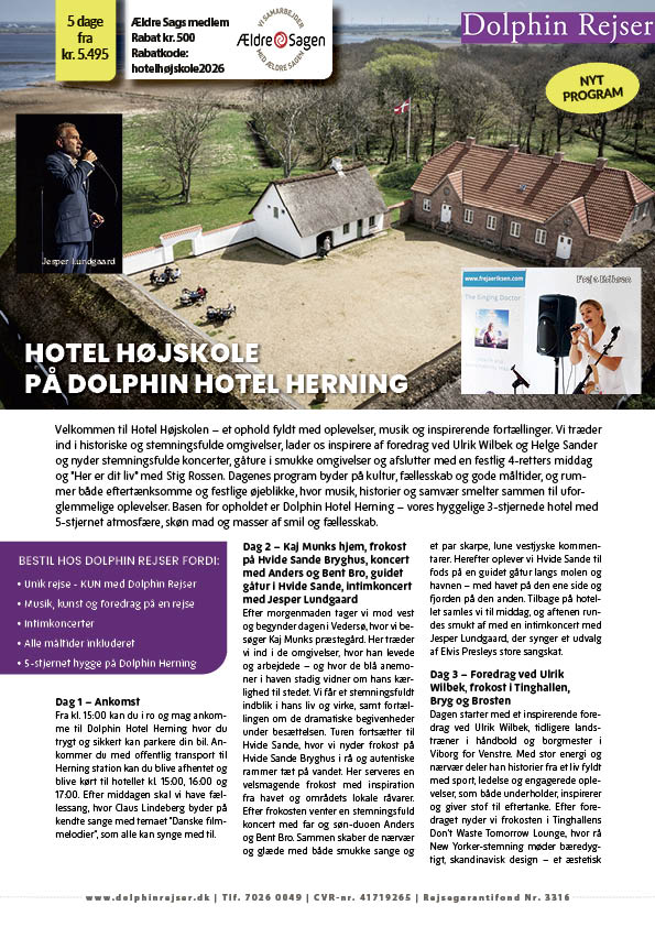Velkommen til Hotel Højskolen – et ophold fyldt med oplevelser, musik og inspirerende fortællinger. Vi træder ind i historiske og stemningsfulde omgivelser, lader os inspirere af foredrag ved Ulrik Wilbek og Helge Sander og nyder stemningsfulde koncerter, gåture i smukke omgivelser og afslutter med en festlig 4-retters middag og "Her er dit liv" med Stig Rossen. Dagenes program byder på kultur, fællesskab og gode måltider, og rummer både eftertænksomme og festlige øjeblikke, hvor musik, historier og samvær smelter sammen til uforglemmelige oplevelser. Basen for opholdet er Dolphin Hotel Herning – vores hyggelige 3-stjernede hotel med 5-stjernet atmosfære, skøn mad og masser af smil og fællesskab.
