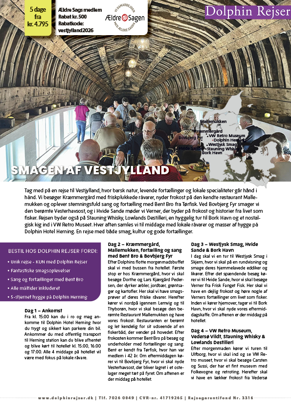 Tag med på en rejse til Vestjylland, hvor barsk natur, levende fortællinger og lokale specialiteter går hånd i hånd. Vi besøger Kræmmergård med friskplukkede råvarer, nyder frokost på den kendte restaurant Mallemukken og oplever stemningsfuld sang og fortælling med Bent Bro fra Tørfisk. Ved Bovbjerg Fyr smager vi den berømte Vesterhavsost, og i Hvide Sande møder vi Verner, der byder på frokost og historier fra livet som fisker. Rejsen byder også på Stauning Whisky, Lowlands Destilleri, en hyggelig tur til Bork Havn og et nostalgisk kig ind i VW Retro Museet. Hver aften samles vi til middage med lokale råvarer og masser af hygge på Dolphin Hotel Herning. En rejse med både smag, kultur og gode fortællinger.